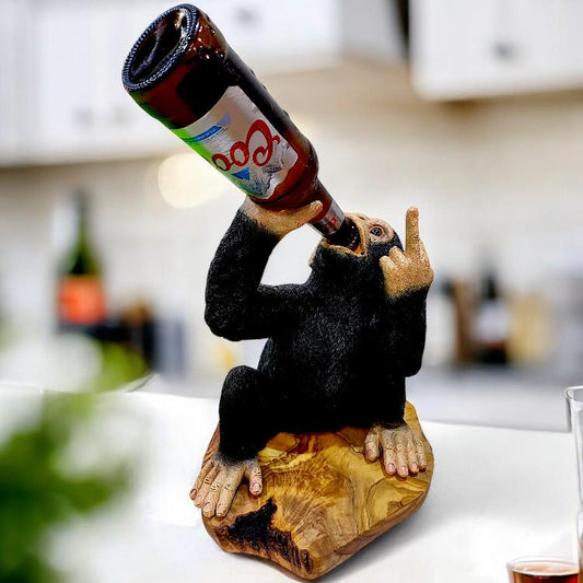 Black Up Yours Monkey Wine Bottle Holder with heart shape olive wood board