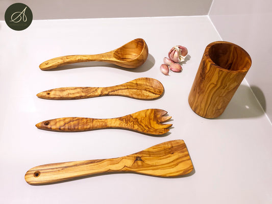 Wooden kitchen set, Olive wood set, Round Utensil Holder, Kitchen Utensils, salad server, Ladle, spatula, restaurant, chef, gift, handmade