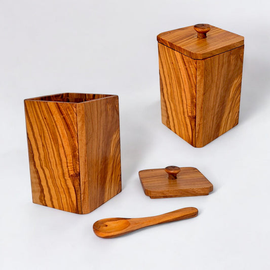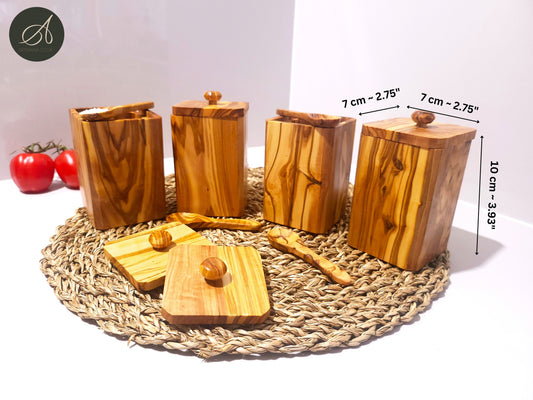 Tea Coffee Sugar Spices Olive Wood Hand Crafted Wooden Jar Container Set of 4 With Lids And Spoons